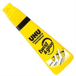 UHU PEGAMENTO UNIVERSAL Twist y Glue, el famoso pegamento universal en un frasco flexible y rellenable con el exclusivo aplicador giratorio para pegar puntos, rayas y superficies. El pegamento ideal de uso universal para la escuela, el hogar o la oficina, útil en manualidades, artesanías, etc. Lavable a 60°C. Pega cartulina, papel, fieltro, cuero, corcho, tela, madera, metal, porcelana, vidrio, Styropor® y muchos plásticos entre otros.